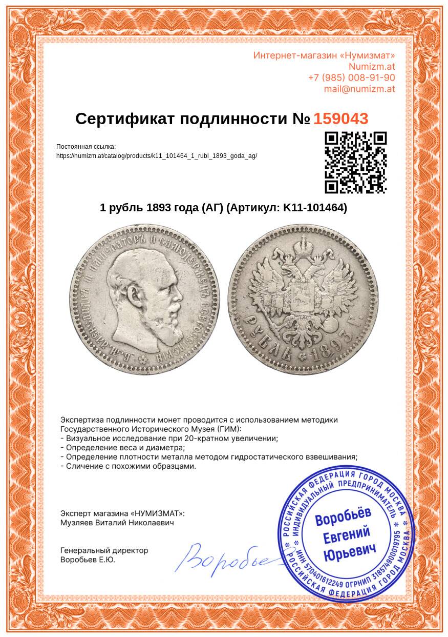 Купить 1 рубль 1893 года (АГ) по привлекательной цене можно в нашем интернет-магазине — Вам достаточно оформить заказ на сайте. Все монеты, представленные в каталоге, находятся в наличии на нашем складе.