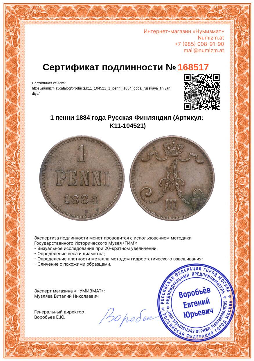 Купить 1 пенни 1884 года Русская Финляндия по привлекательной цене можно в нашем интернет-магазине — Вам достаточно оформить заказ на сайте. Все монеты, представленные в каталоге, находятся в наличии на нашем складе.