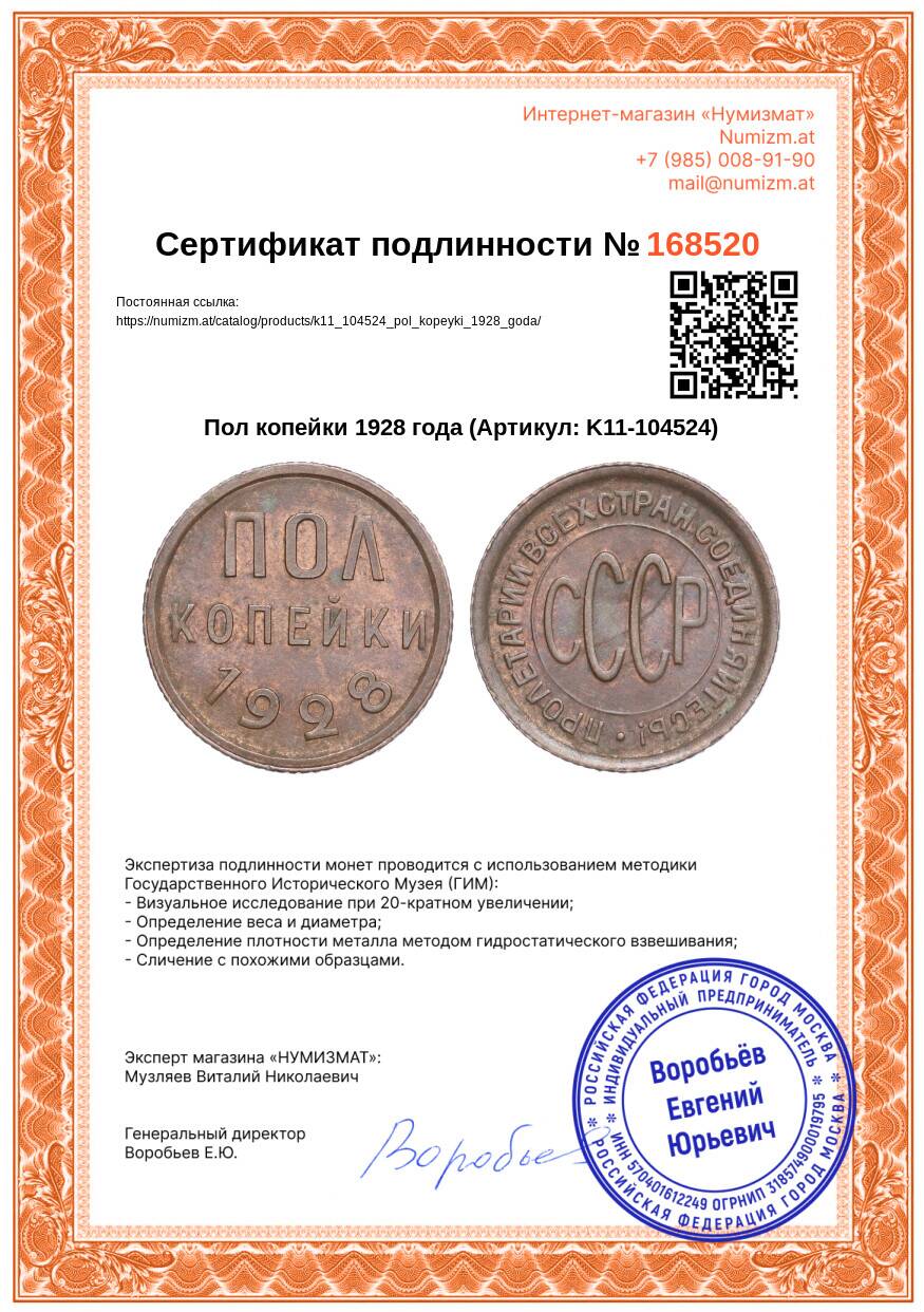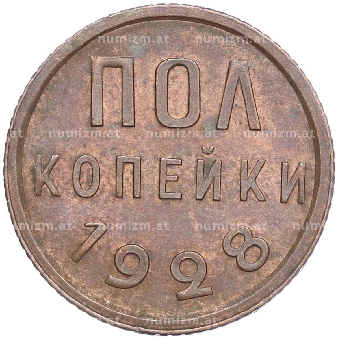 Монета Пол копейки 1928 года (Артикул: K11-104524): подробные характеристики, качественные фотографии в высоком разрешении, низкая цена.