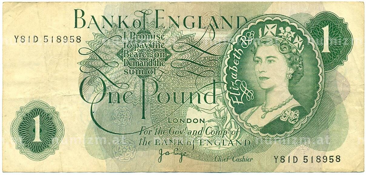 • Банкнота 1 фунт 1970 года Великобритания (Банк Англии) (Артикул: K11-112716) — Фото №1 Банкнота 1 фунт 1970 года Великобритания (Банк Англии) (Артикул: K11-112716) — Фото №2