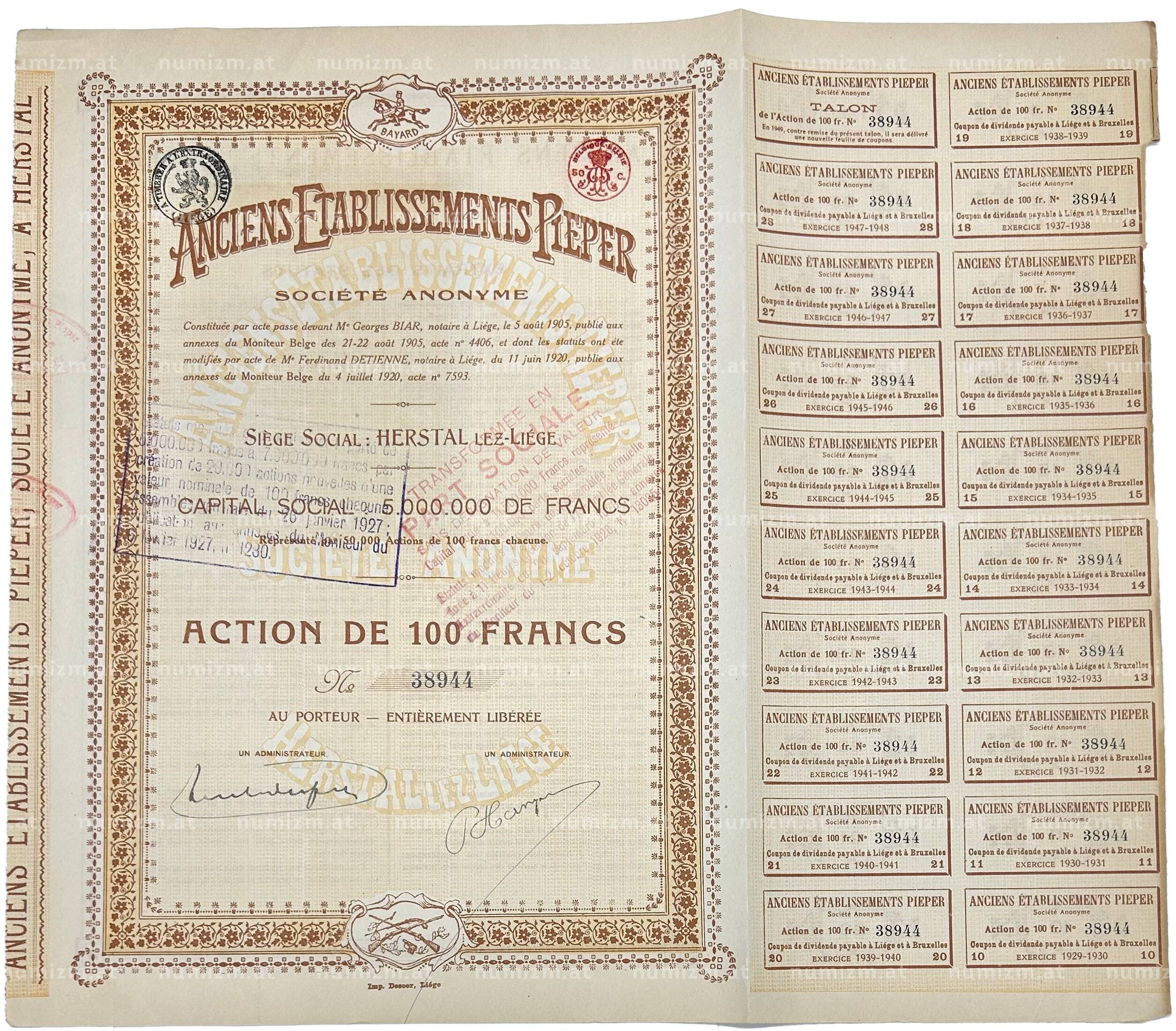 Купить Акция на 100 франков оружейной компании имени Пепера 1920 года Бельгия по привлекательной цене можно в нашем интернет-магазине — Вам достаточно оформить заказ на сайте. Все монеты, представленные в каталоге, находятся в наличии на нашем складе.