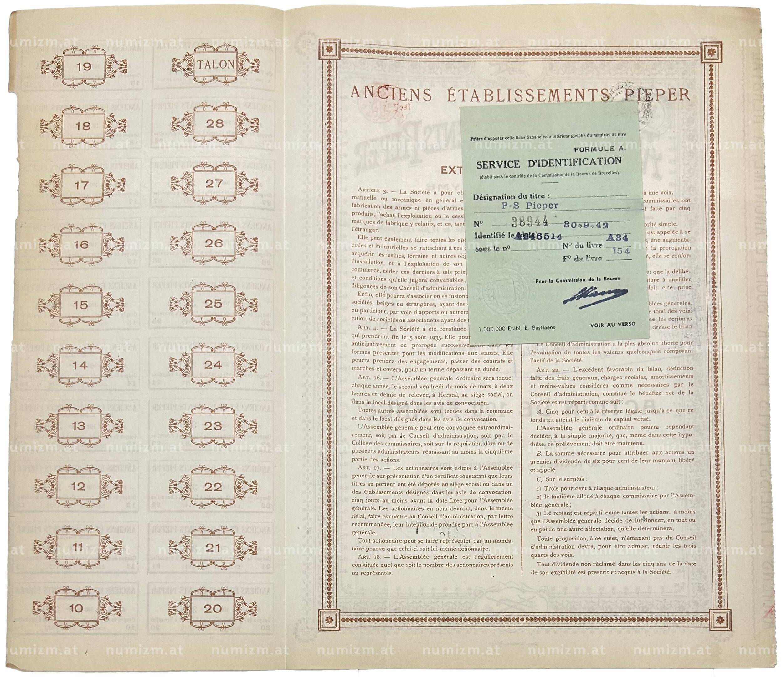 20.01.2025Интернет магазин «Нумизмат» предлагает приобрести Акция на 100 франков оружейной компании имени Пепера 1920 года Бельгия.