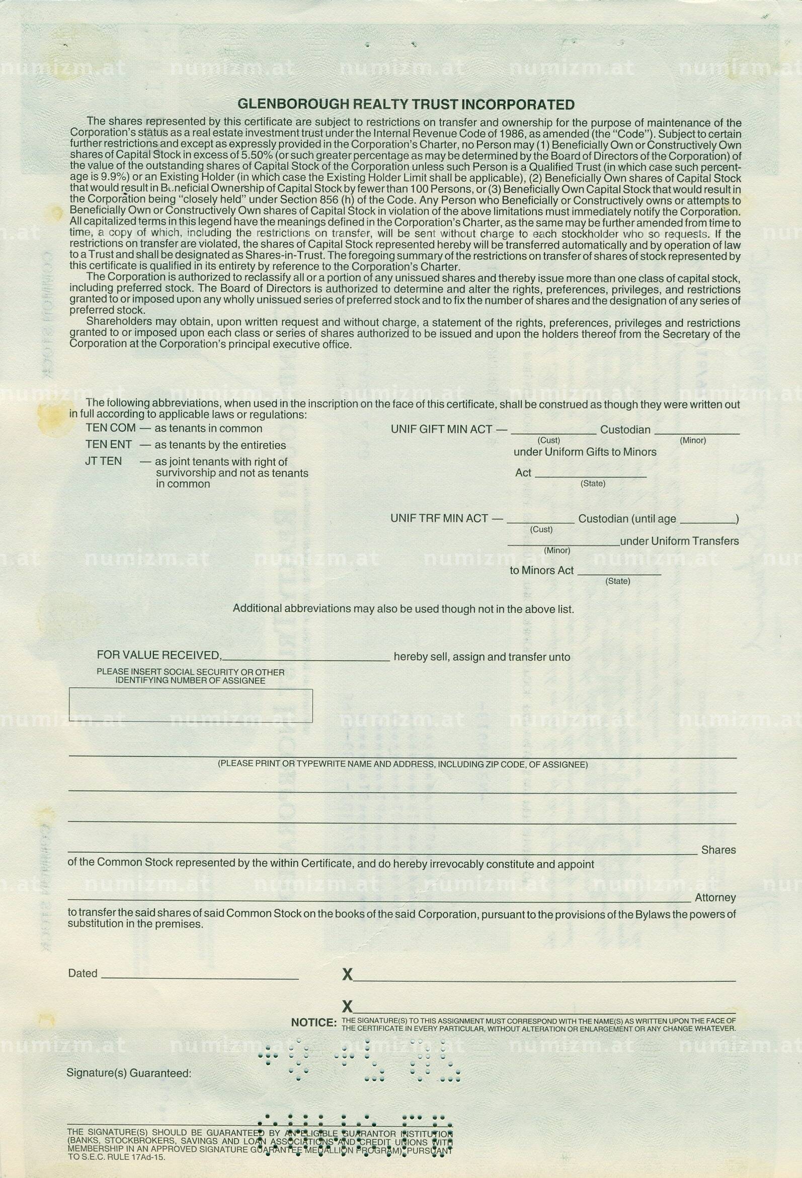 20.01.2025Интернет магазин «Нумизмат» предлагает приобрести Акция на 18 долей «Glenborough Realty Trust Incorporated» 1997 года.