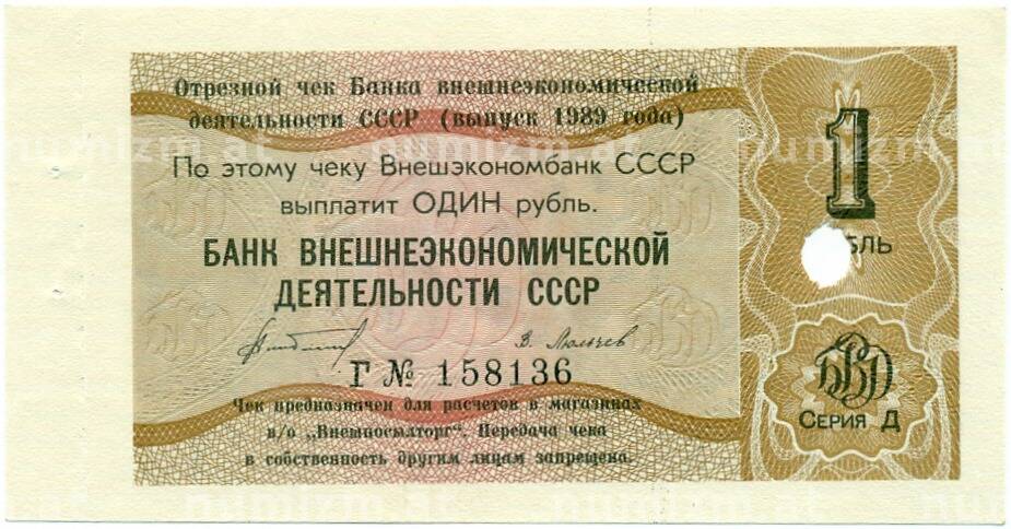 Купить 1 рубль 1989 года Отрезной чек Банка для внешней торговли СССР — серия Д (погашенный) по привлекательной цене можно в нашем интернет-магазине — Вам достаточно оформить заказ на сайте. Все монеты, представленные в каталоге, находятся в наличии на нашем складе.