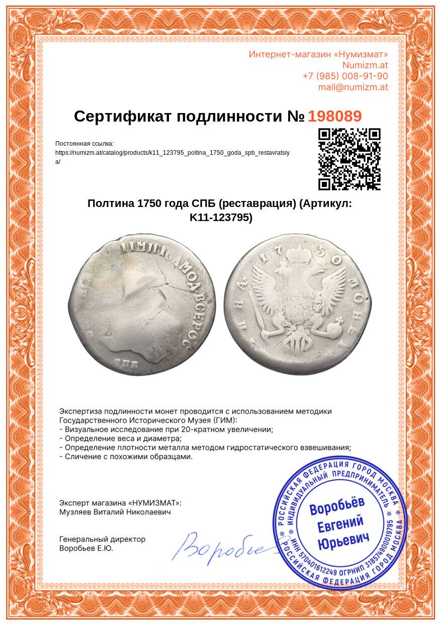 20.01.2025Интернет магазин «Нумизмат» предлагает приобрести Полтина 1750 года СПБ (реставрация).