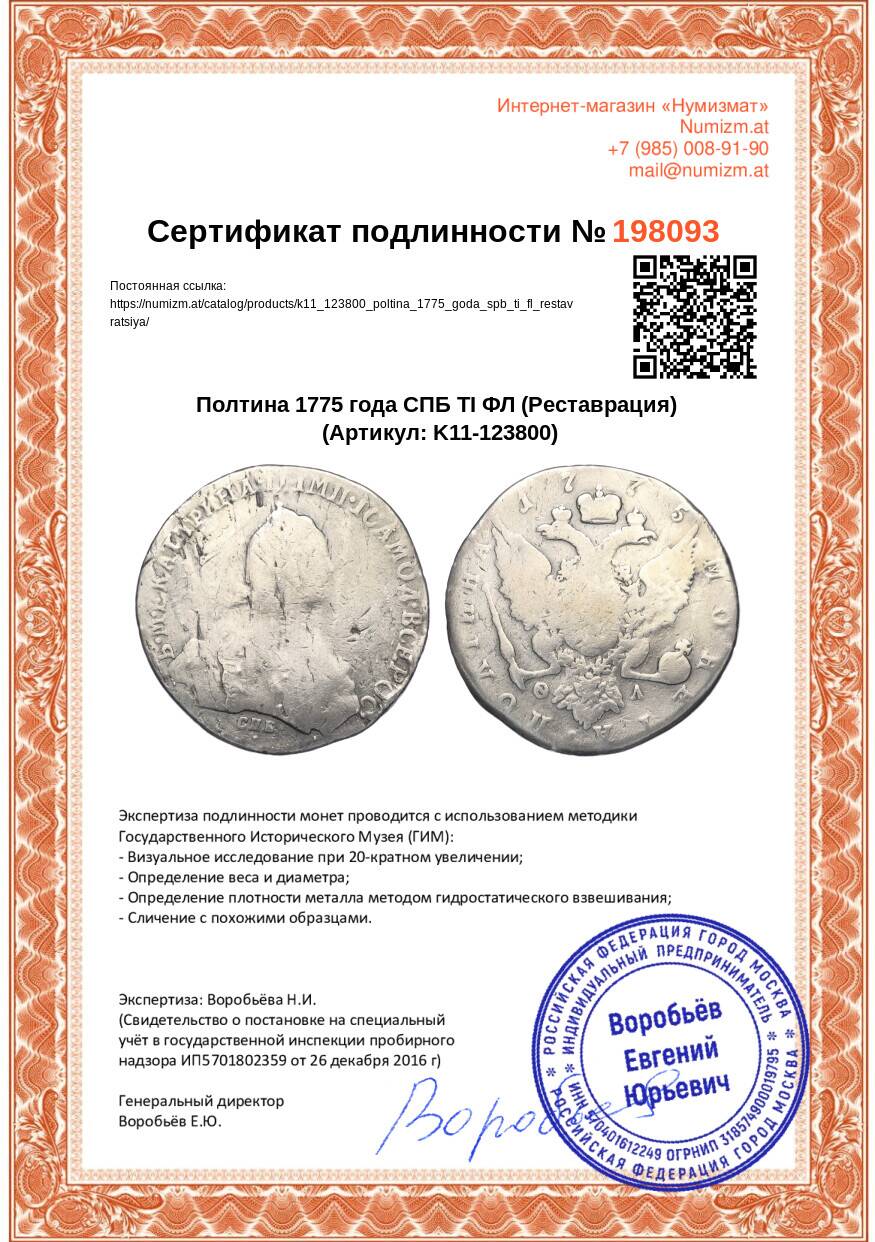 Купить Полтина 1775 года СПБ ТI ФЛ (Реставрация) по привлекательной цене можно в нашем интернет-магазине — Вам достаточно оформить заказ на сайте. Все монеты, представленные в каталоге, находятся в наличии на нашем складе.