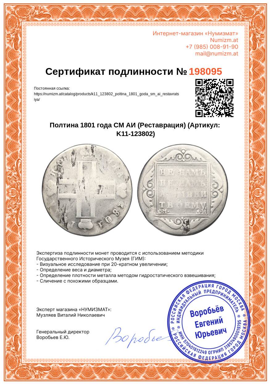 Купить Полтина 1801 года СМ АИ (Реставрация) по привлекательной цене можно в нашем интернет-магазине — Вам достаточно оформить заказ на сайте. Все монеты, представленные в каталоге, находятся в наличии на нашем складе.
