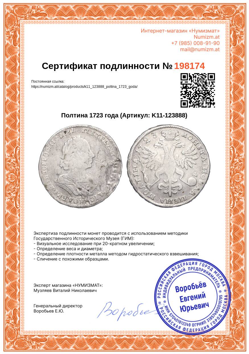 20.01.2025Интернет магазин «Нумизмат» предлагает приобрести Полтина 1723 года.