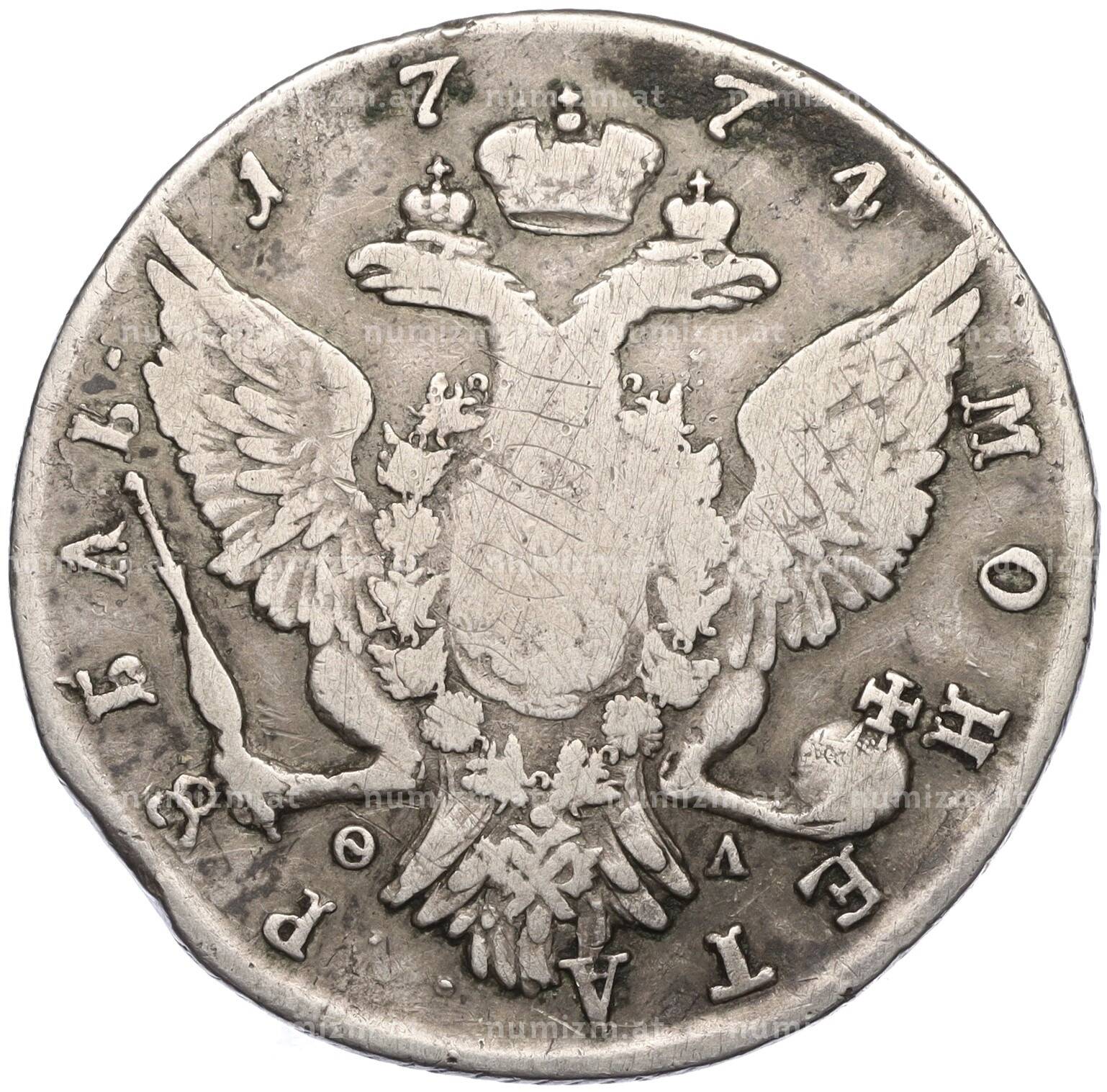 Купить 1 рубль 1774 года СПБ ТI ФЛ по привлекательной цене можно в нашем интернет-магазине — Вам достаточно оформить заказ на сайте. Все монеты, представленные в каталоге, находятся в наличии на нашем складе.