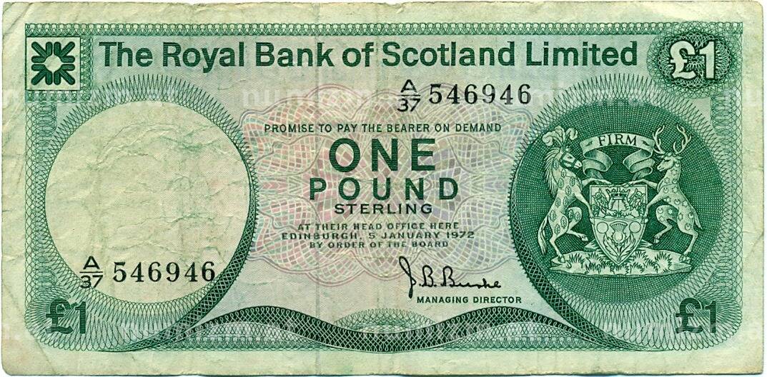 20.01.2025Интернет магазин «Нумизмат» предлагает приобрести 1 фунт стерлингов 1972 года Великобритания (Банк Шотландии).