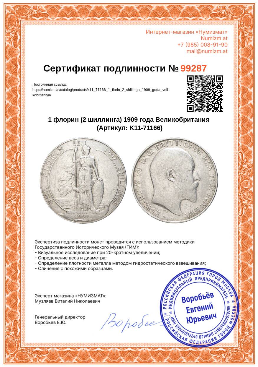 Интернет магазин «Нумизмат» предлагает приобрести 1 флорин (2 шиллинга) 1909 года Великобритания.