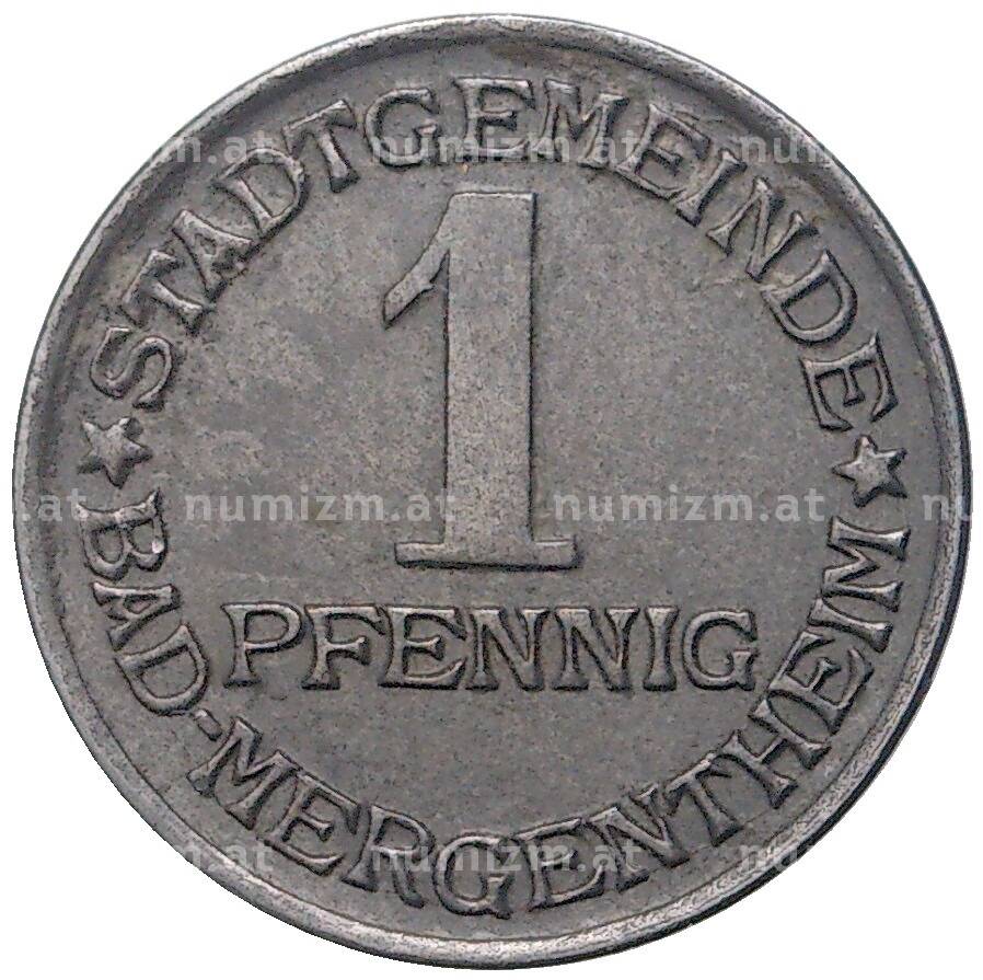Монета 1 пфенниг 1920 года Германия — город Мергентхайм (Нотгельд) (Артикул: K11-78187): подробные характеристики, качественные фотографии в высоком разрешении, низкая цена.