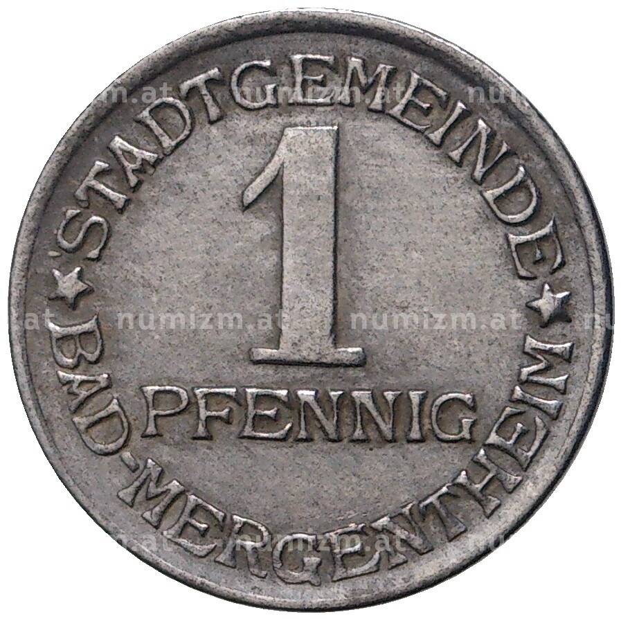 Монета 1 пфенниг 1920 года Германия — город Мергентхайм (Нотгельд) (Артикул: K11-78189): подробные характеристики, качественные фотографии в высоком разрешении, низкая цена.