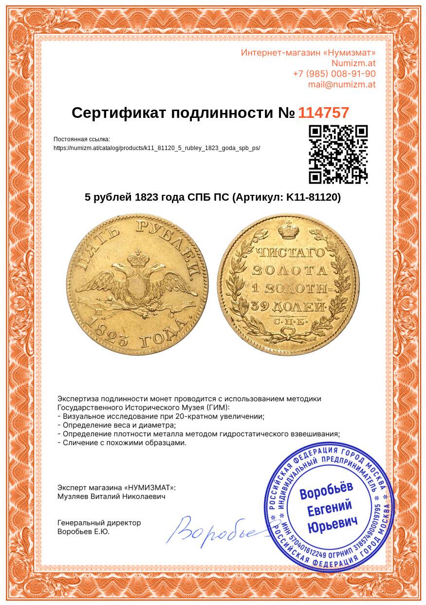 20.01.2025Интернет магазин «Нумизмат» предлагает приобрести 5 рублей 1823 года СПБ ПС.
