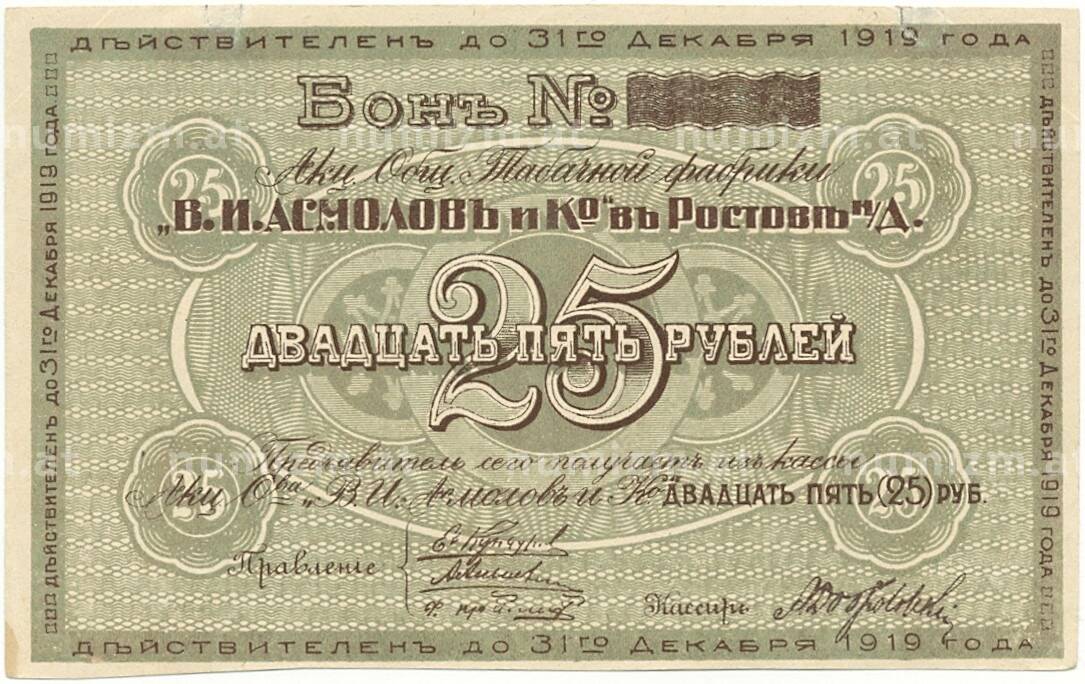 Купить 25 рублей 1919 года Акционерное общество табачной фабрики Асмолов (Ростов-на-Дону) по привлекательной цене можно в нашем интернет-магазине — Вам достаточно оформить заказ на сайте. Все монеты, представленные в каталоге, находятся в наличии на нашем складе.