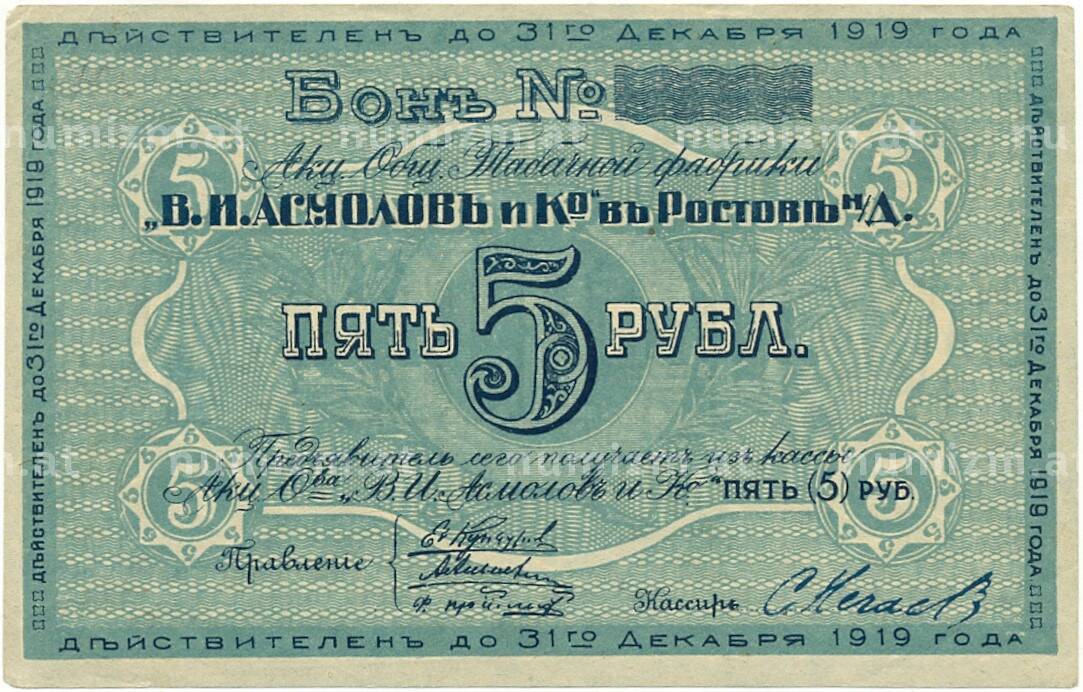 Купить 5 рублей 1919 года Акционерное общество табачной фабрики Асмолов (Ростов-на-Дону) по привлекательной цене можно в нашем интернет-магазине — Вам достаточно оформить заказ на сайте. Все монеты, представленные в каталоге, находятся в наличии на нашем складе.