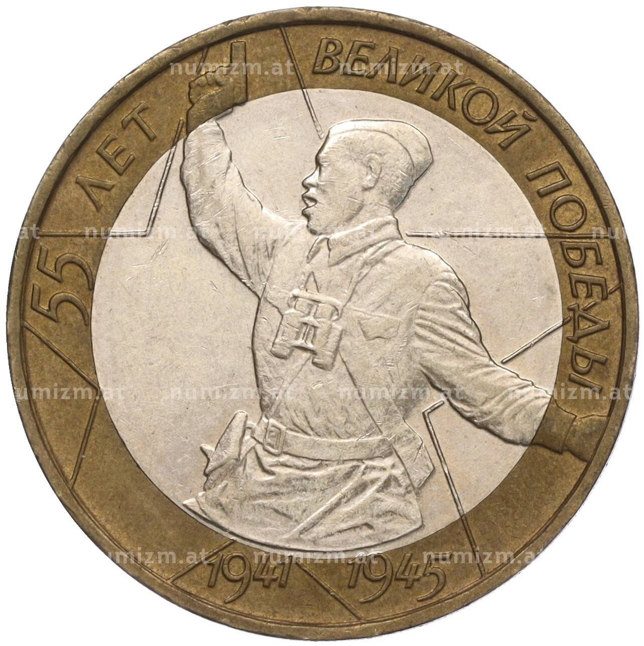 Купить 10 рублей 2000 года ММД «55 лет Великой Победы» по привлекательной цене можно в нашем интернет-магазине — Вам достаточно оформить заказ на сайте. Все монеты, представленные в каталоге, находятся в наличии на нашем складе.