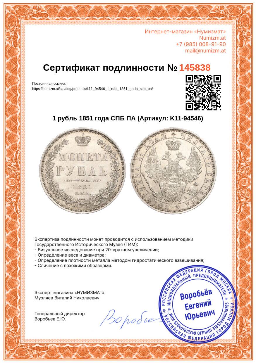 20.01.2025Интернет магазин «Нумизмат» предлагает приобрести 1 рубль 1851 года СПБ ПА.