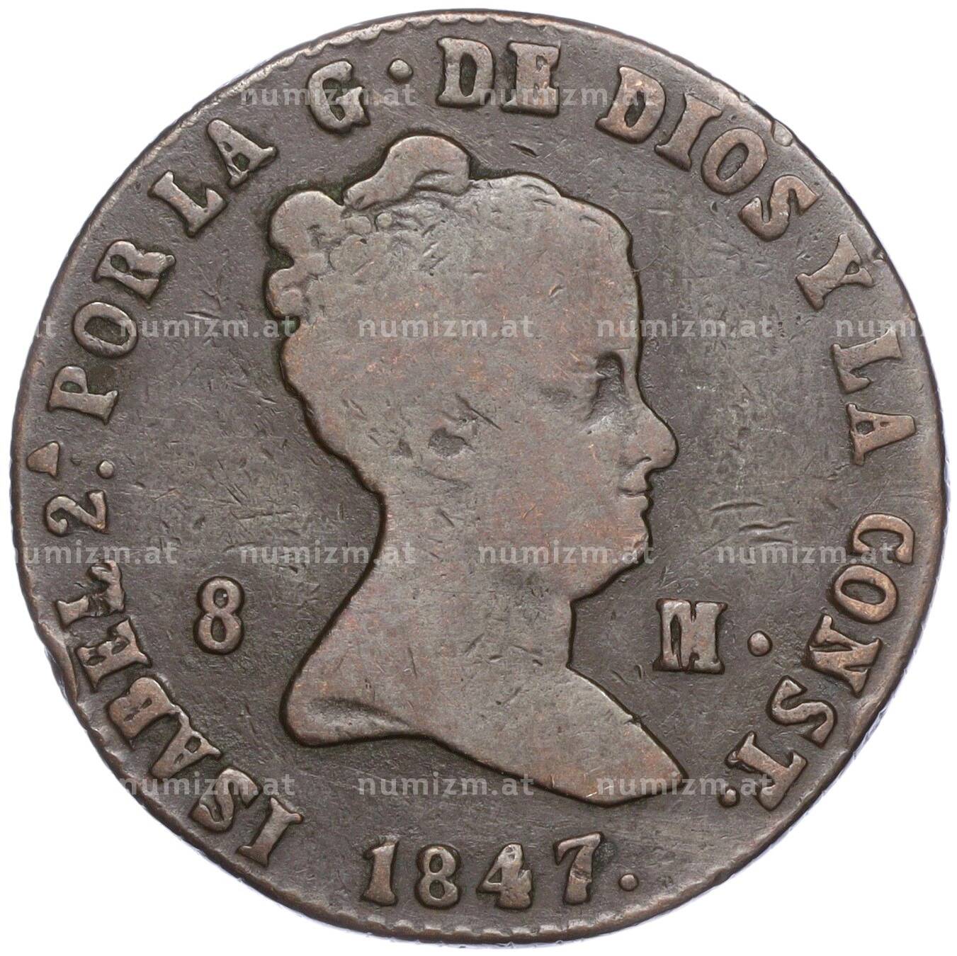 Купить 8 мараведи 1847 года Испания по привлекательной цене можно в нашем интернет-магазине — Вам достаточно оформить заказ на сайте. Все монеты, представленные в каталоге, находятся в наличии на нашем складе.