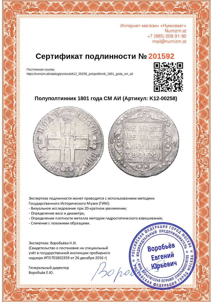 20.01.2025Интернет магазин «Нумизмат» предлагает приобрести Полуполтинник 1801 года СМ АИ.