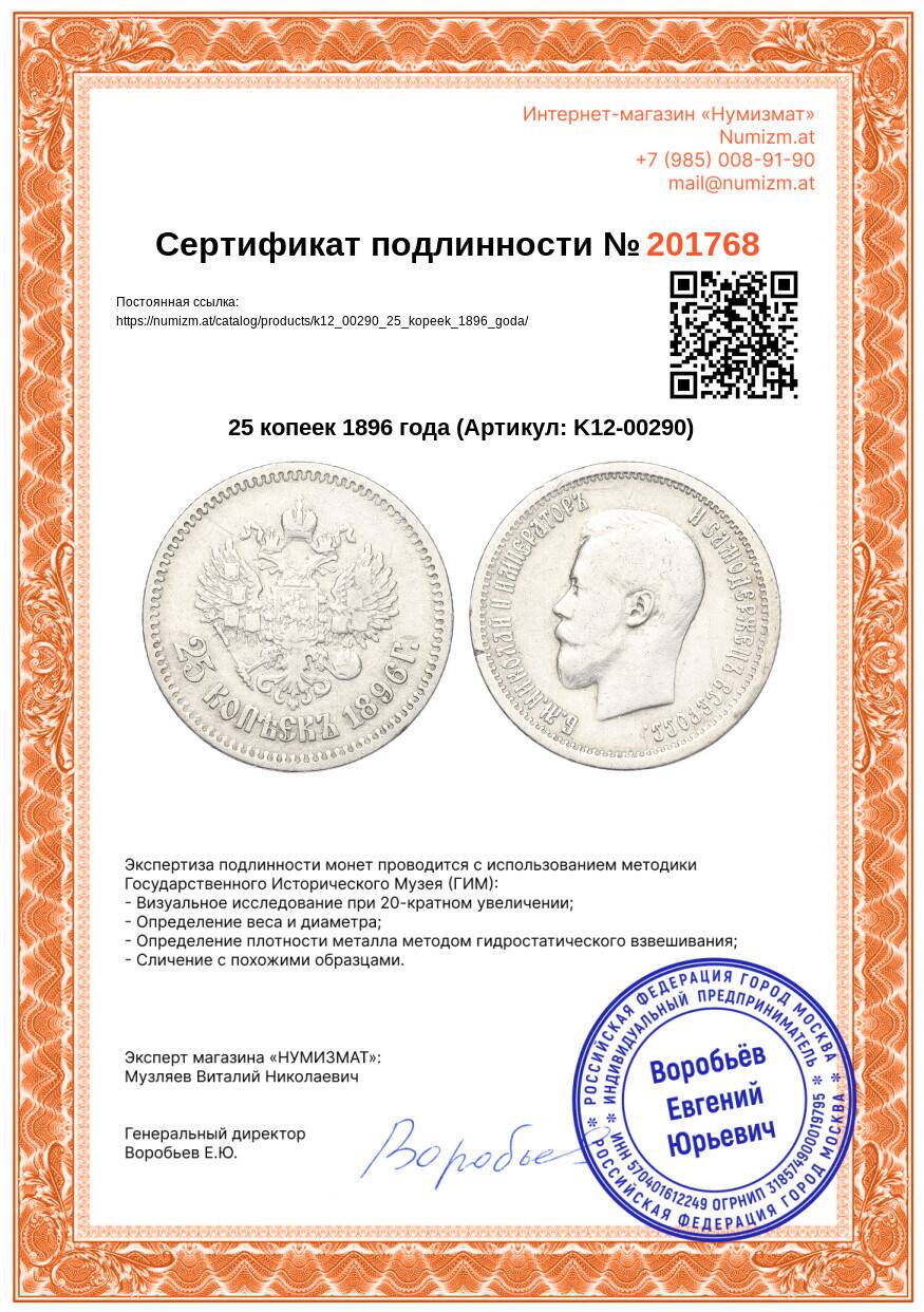 Монета 25 копеек 1896 года (Артикул: K12-00290): подробные характеристики, качественные фотографии в высоком разрешении, низкая цена.