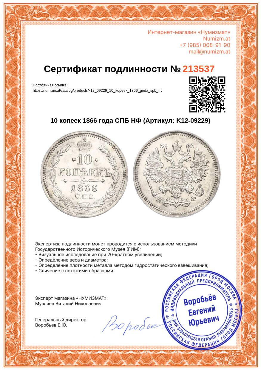 20.01.2025Интернет магазин «Нумизмат» предлагает приобрести 10 копеек 1866 года СПБ НФ.