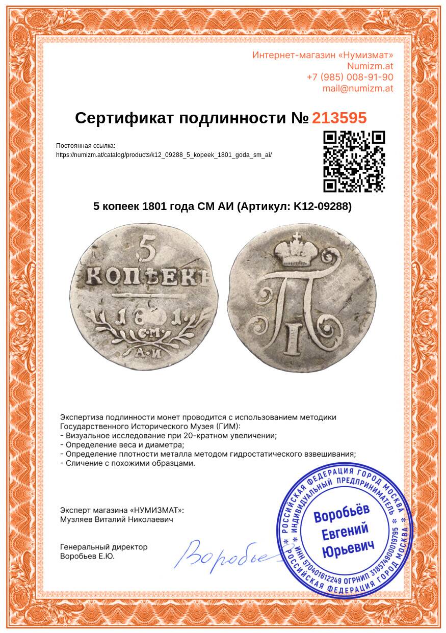 20.01.2025Интернет магазин «Нумизмат» предлагает приобрести 5 копеек 1801 года СМ АИ.