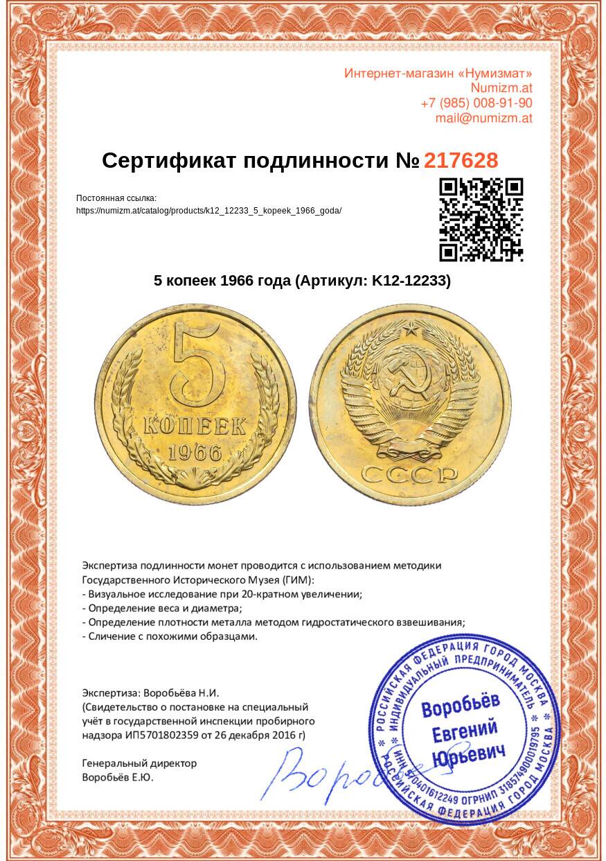 Монета 5 копеек 1966 года (Артикул: K12-12233): подробные характеристики, качественные фотографии в высоком разрешении, низкая цена.