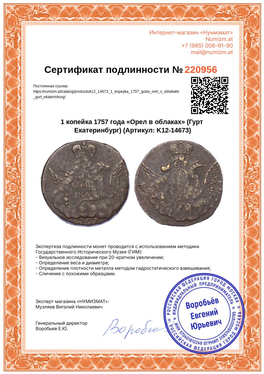 Купить 1 копейка 1757 года «Орел в облаках» (Гурт Екатеринбург) по привлекательной цене можно в нашем интернет-магазине — Вам достаточно оформить заказ на сайте. Все монеты, представленные в каталоге, находятся в наличии на нашем складе.
