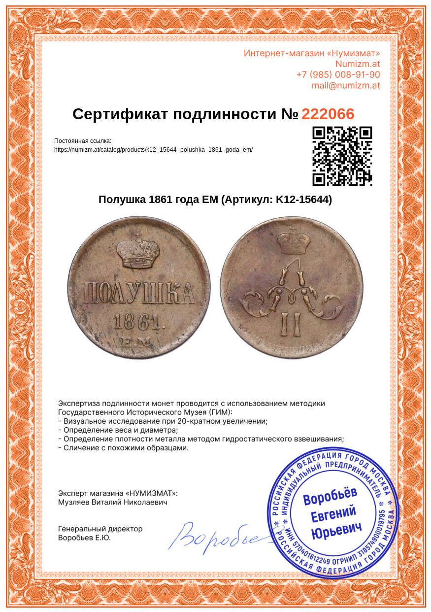 Купить Полушка 1861 года ЕМ по привлекательной цене можно в нашем интернет-магазине — Вам достаточно оформить заказ на сайте. Все монеты, представленные в каталоге, находятся в наличии на нашем складе.