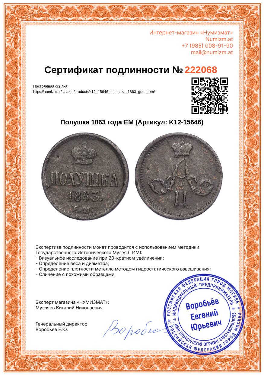 Купить Полушка 1863 года ЕМ по привлекательной цене можно в нашем интернет-магазине — Вам достаточно оформить заказ на сайте. Все монеты, представленные в каталоге, находятся в наличии на нашем складе.