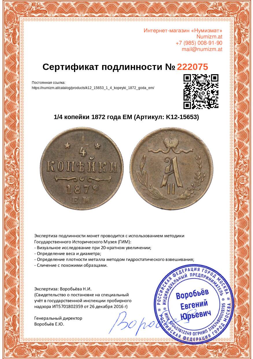 Купить 1/4 копейки 1872 года ЕМ по привлекательной цене можно в нашем интернет-магазине — Вам достаточно оформить заказ на сайте. Все монеты, представленные в каталоге, находятся в наличии на нашем складе.