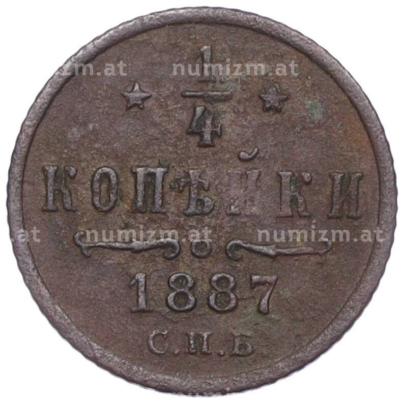 Купить 1/4 копейки 1887 года СПБ по привлекательной цене можно в нашем интернет-магазине — Вам достаточно оформить заказ на сайте. Все монеты, представленные в каталоге, находятся в наличии на нашем складе.