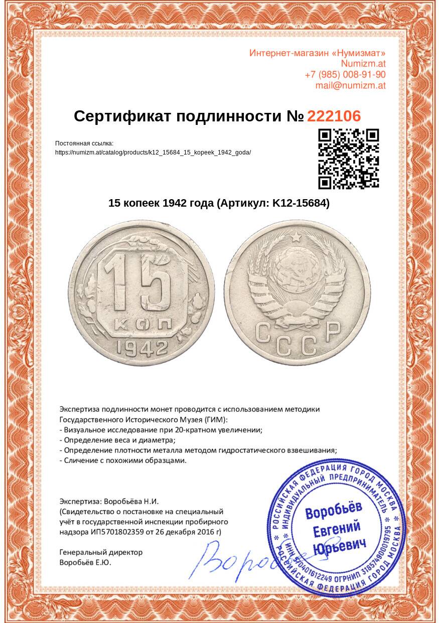 Купить 15 копеек 1942 года по привлекательной цене можно в нашем интернет-магазине — Вам достаточно оформить заказ на сайте. Все монеты, представленные в каталоге, находятся в наличии на нашем складе.