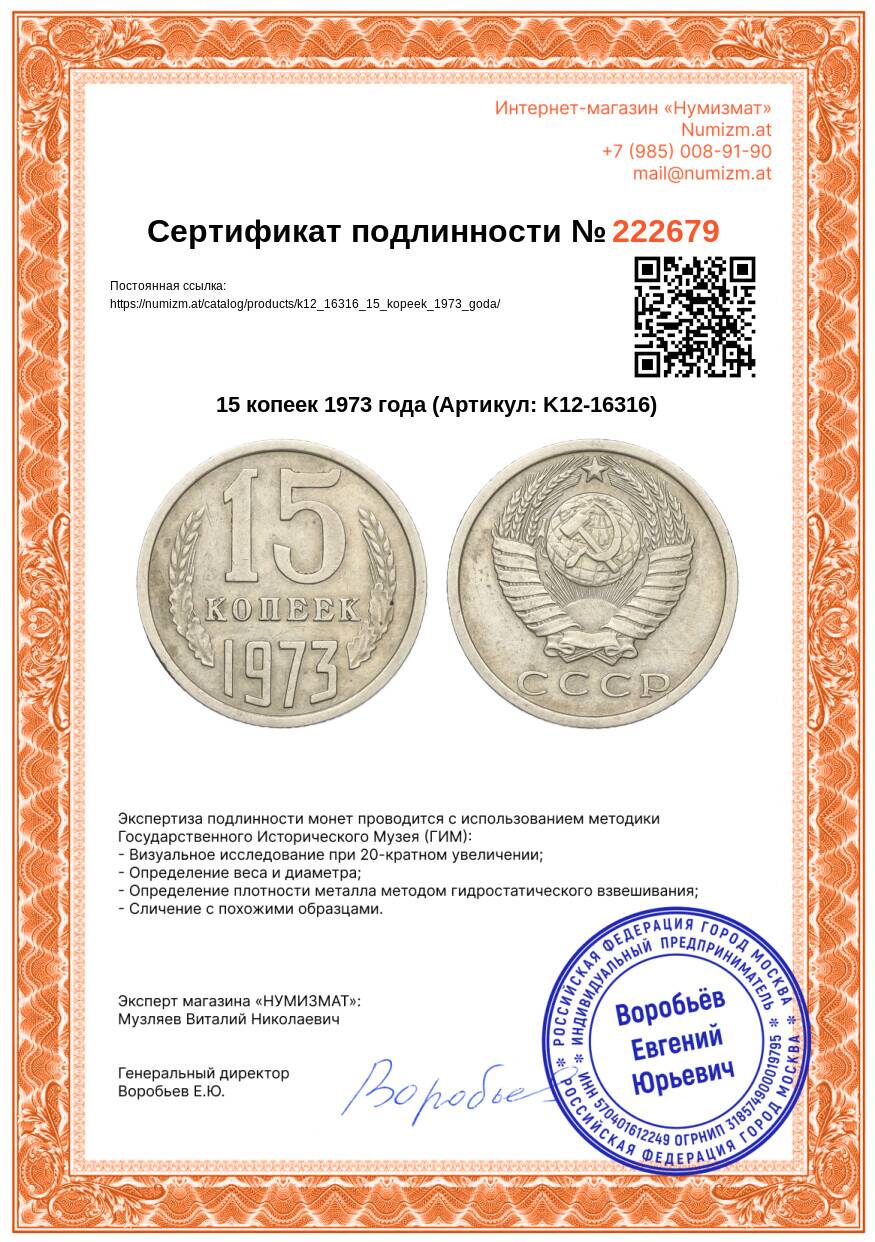 20.01.2025Интернет магазин «Нумизмат» предлагает приобрести 15 копеек 1973 года.