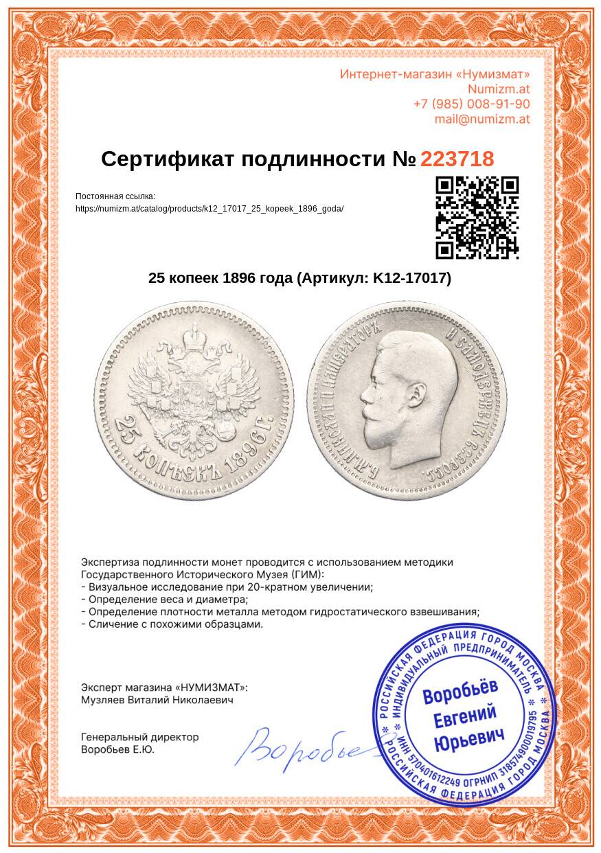 Монета 25 копеек 1896 года (Артикул: K12-17017): подробные характеристики, качественные фотографии в высоком разрешении, низкая цена.