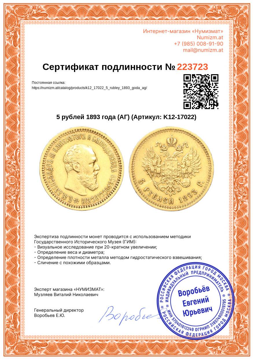 Купить 5 рублей 1893 года (АГ) по привлекательной цене можно в нашем интернет-магазине — Вам достаточно оформить заказ на сайте. Все монеты, представленные в каталоге, находятся в наличии на нашем складе.