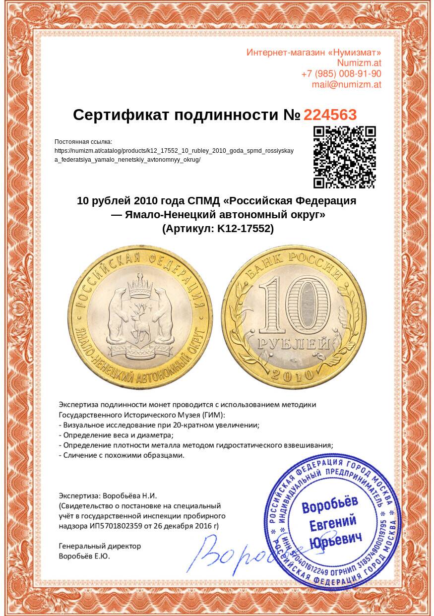 20.01.2025Интернет магазин «Нумизмат» предлагает приобрести 10 рублей 2010 года СПМД «Российская Федерация — Ямало-Ненецкий автономный округ».