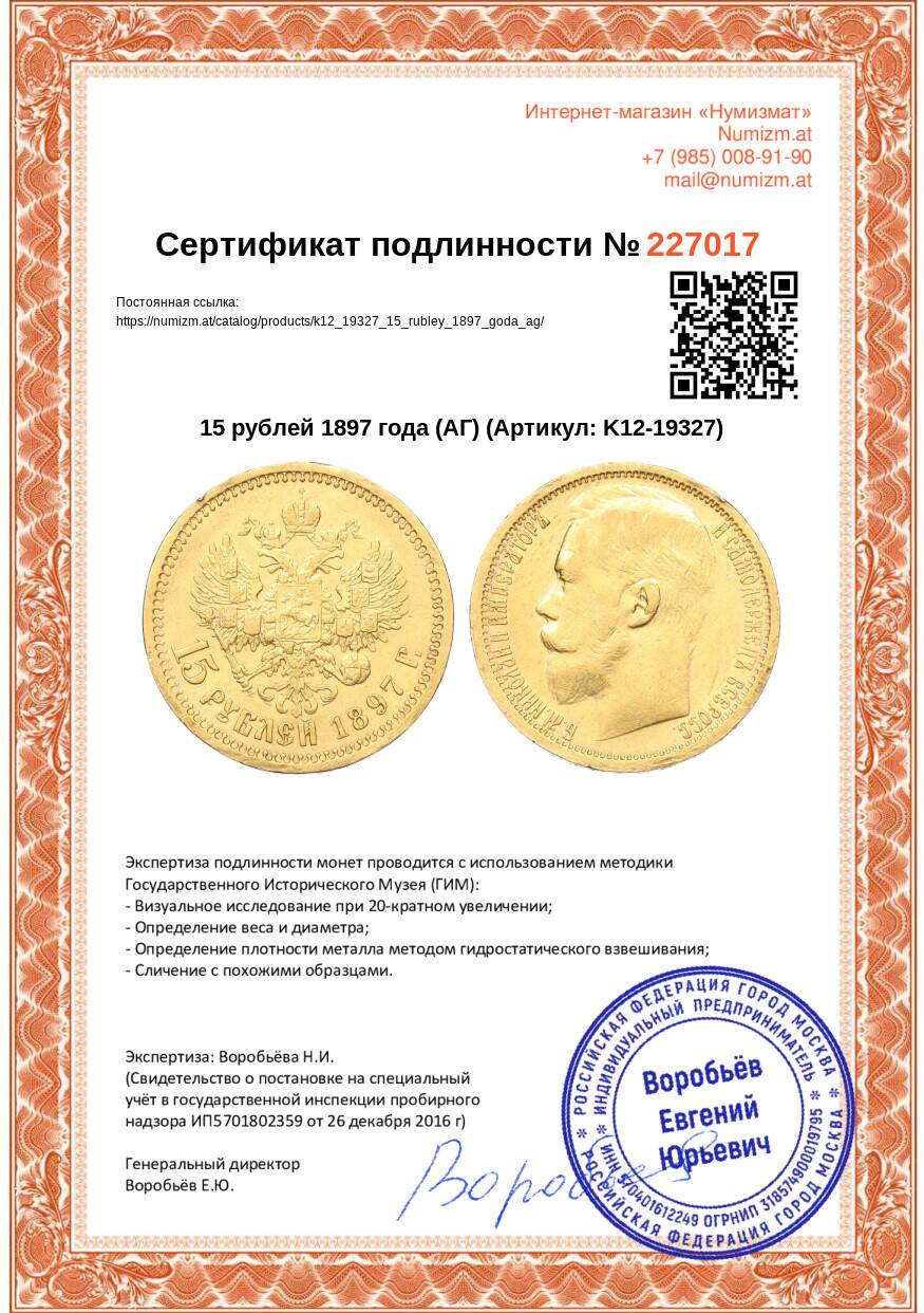 20.01.2025Интернет магазин «Нумизмат» предлагает приобрести 15 рублей 1897 года (АГ).