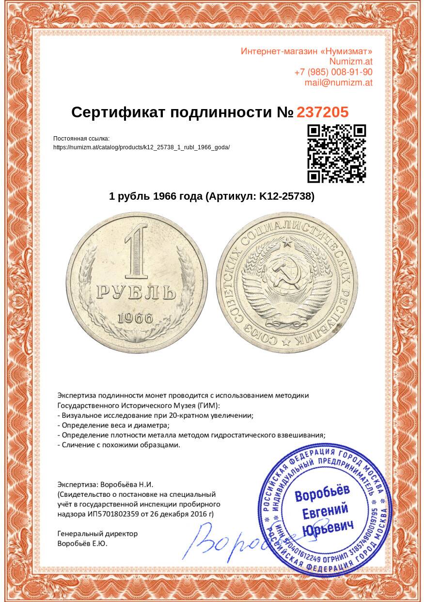 Монета 1 рубль 1966 года (Артикул: K12-25738): подробные характеристики, качественные фотографии в высоком разрешении, низкая цена.
