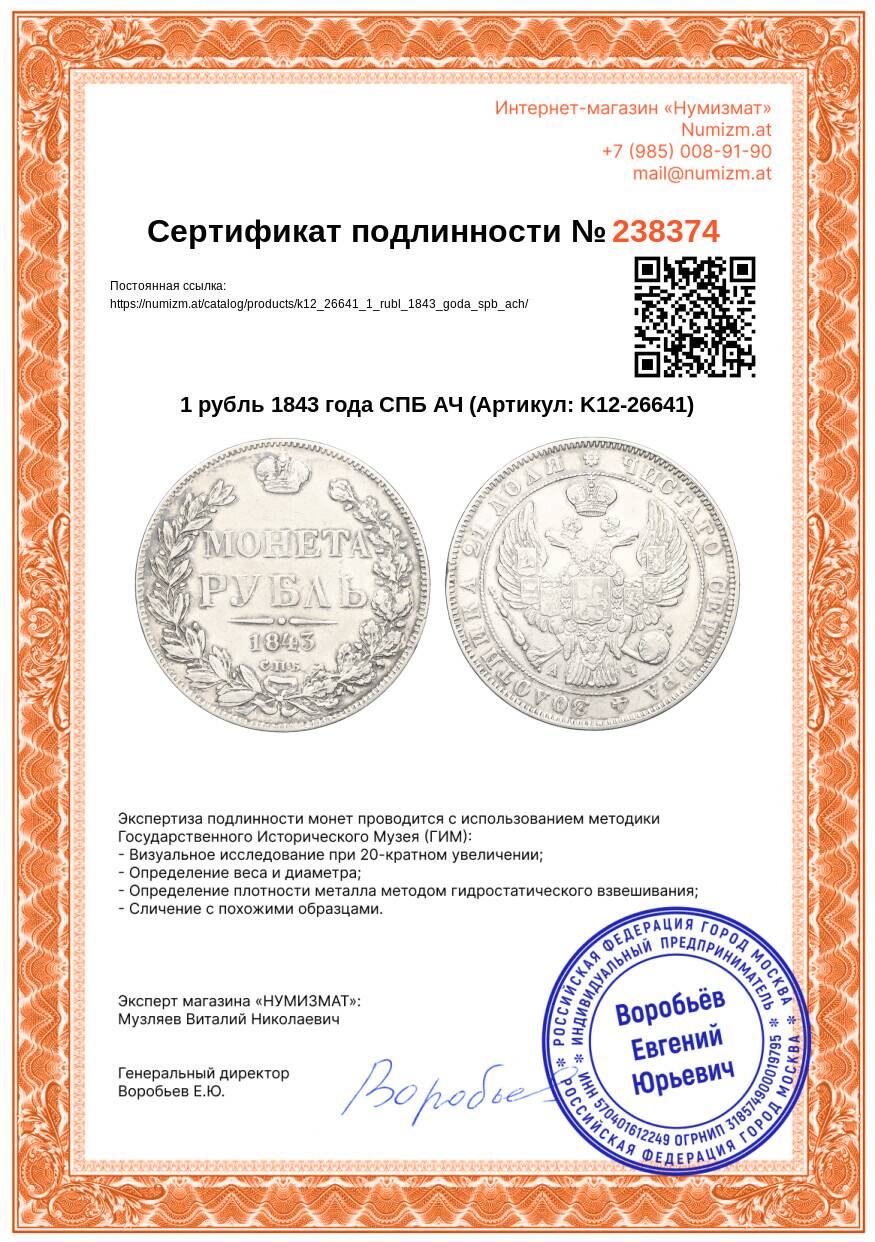 20.01.2025Интернет магазин «Нумизмат» предлагает приобрести 1 рубль 1843 года СПБ АЧ.