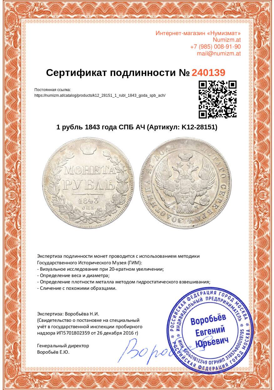 Купить 1 рубль 1843 года СПБ АЧ по привлекательной цене можно в нашем интернет-магазине — Вам достаточно оформить заказ на сайте. Все монеты, представленные в каталоге, находятся в наличии на нашем складе.