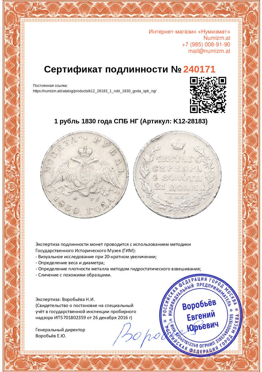 Купить 1 рубль 1830 года СПБ НГ по привлекательной цене можно в нашем интернет-магазине — Вам достаточно оформить заказ на сайте. Все монеты, представленные в каталоге, находятся в наличии на нашем складе.