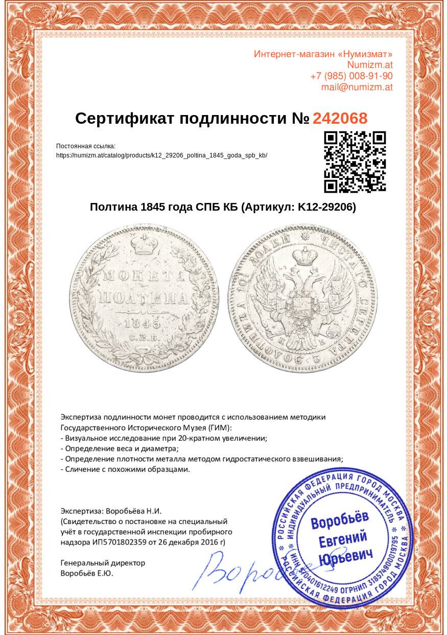 Купить Полтина 1845 года СПБ КБ по привлекательной цене можно в нашем интернет-магазине — Вам достаточно оформить заказ на сайте. Все монеты, представленные в каталоге, находятся в наличии на нашем складе.