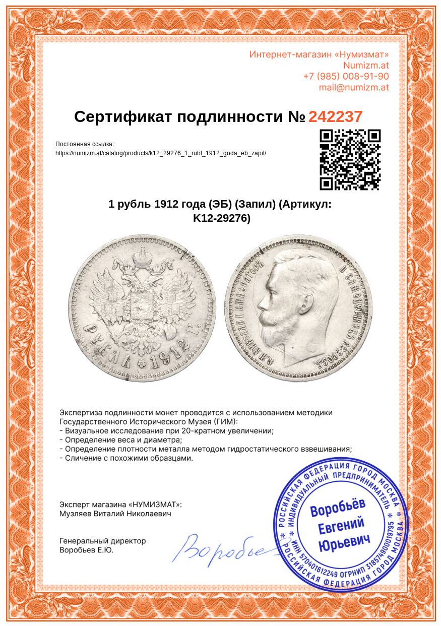 Купить 1 рубль 1912 года (ЭБ) (Запил) по привлекательной цене можно в нашем интернет-магазине — Вам достаточно оформить заказ на сайте. Все монеты, представленные в каталоге, находятся в наличии на нашем складе.
