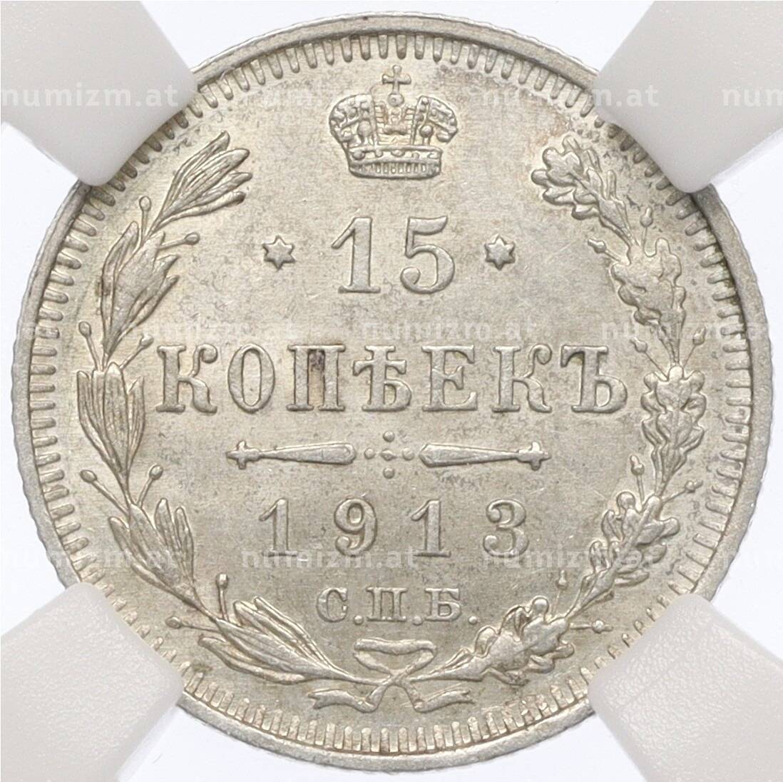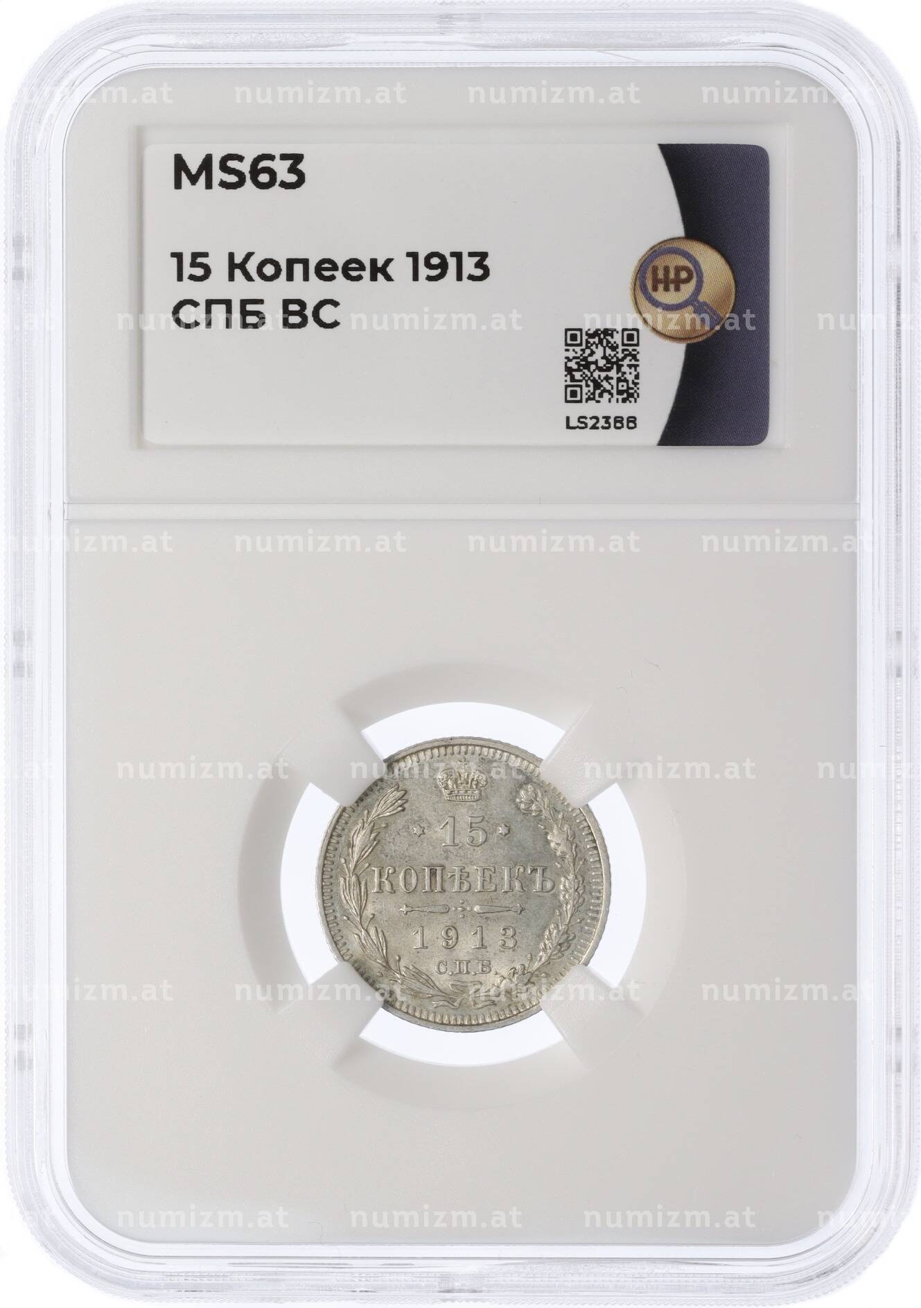 Купить 15 копеек 1913 года СПБ ВС — в слабе ННР (MS63) по привлекательной цене можно в нашем интернет-магазине — Вам достаточно оформить заказ на сайте. Все монеты, представленные в каталоге, находятся в наличии на нашем складе.