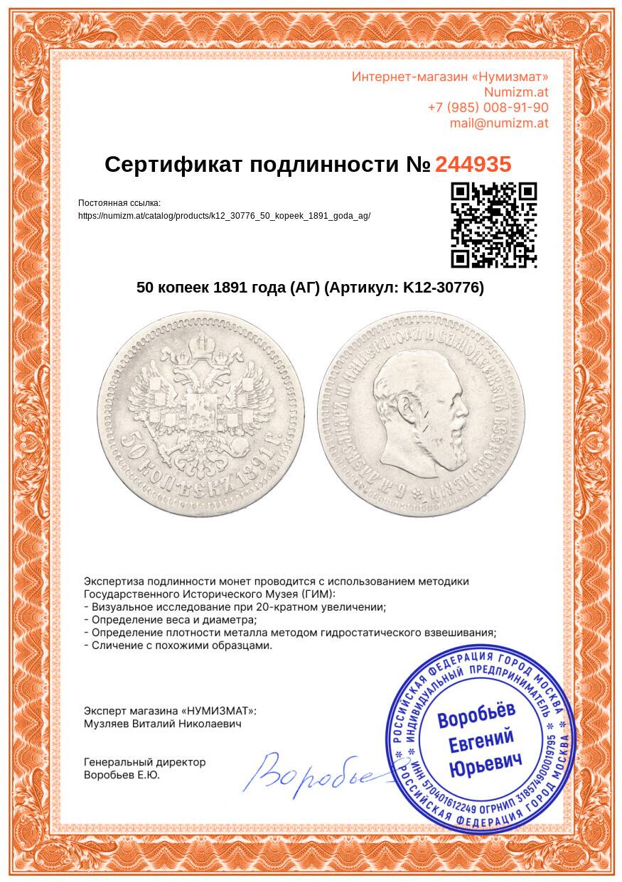 20.01.2025Интернет магазин «Нумизмат» предлагает приобрести 50 копеек 1891 года (АГ).