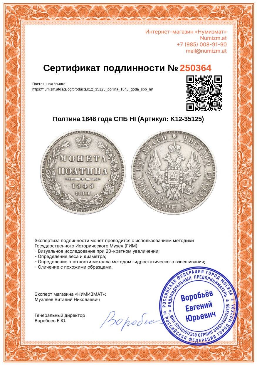 20.01.2025Интернет магазин «Нумизмат» предлагает приобрести Полтина 1848 года СПБ НI.