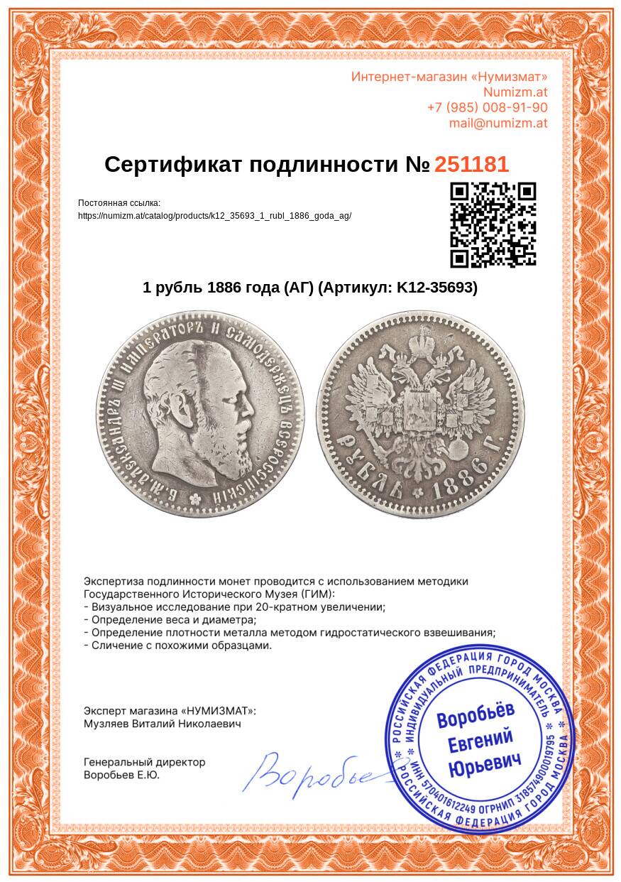 20.01.2025Интернет магазин «Нумизмат» предлагает приобрести 1 рубль 1886 года (АГ).