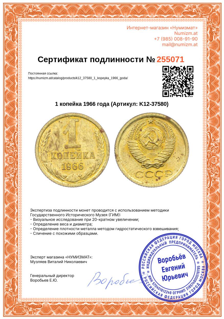 20.01.2025Интернет магазин «Нумизмат» предлагает приобрести 1 копейка 1966 года.